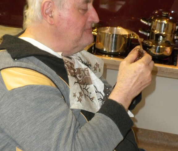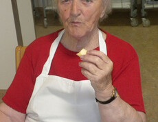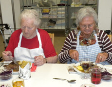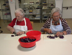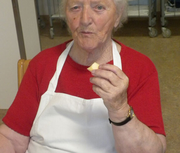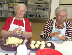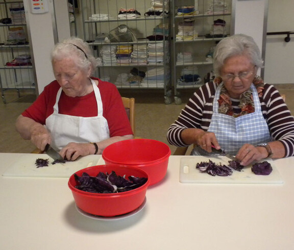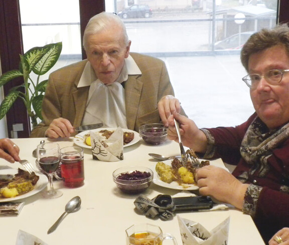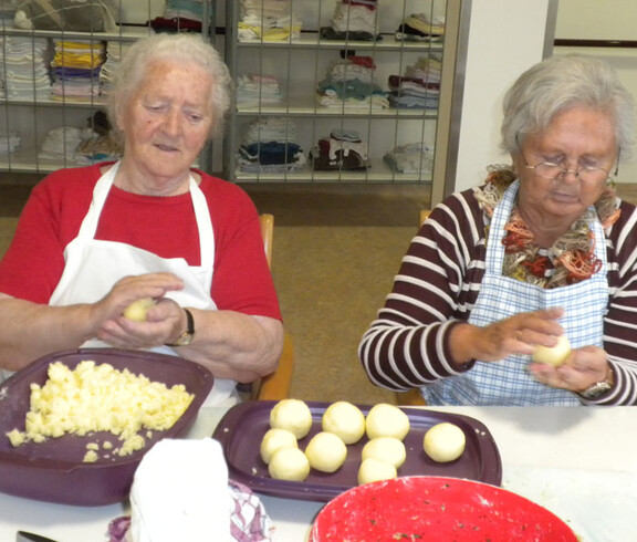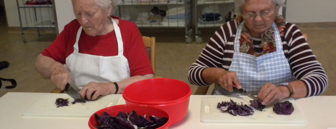 Am 11. November haben sich Sr. Eva und einige Bewohner daran gemacht ein Martinigansl zu braten. Am frühen Vormittag begannen schon die Vorbereitungsarbeiten. Mit frischen Kräutern, Äpfeln und Maroni wurde das Geflügel gefüllt und im Rohr gebraten. Während dessen haben die beiden Damen Äpfel und Zwiebel für das Rotkraut geschnitten. Sr. Eva bereitete dieses am Ofen fertig zu. In der Zeit wurden bei den Bewohnern Rezepte und Kocherfahrungen aus früheren Zeiten ausgetauscht und es entstand eine harmonische Stimmung. Anschließend wurde von den Frauen Kartoffelteig geknetet und Knödel geformt. Zusammen mit Sr. Eva wurde die Mahlzeit fertig gekocht und von den Bewohnern serviert. Gemeinsam ließen sie sich das köstlich gebratene Gansl bei einem Glas Rotwein schmecken.