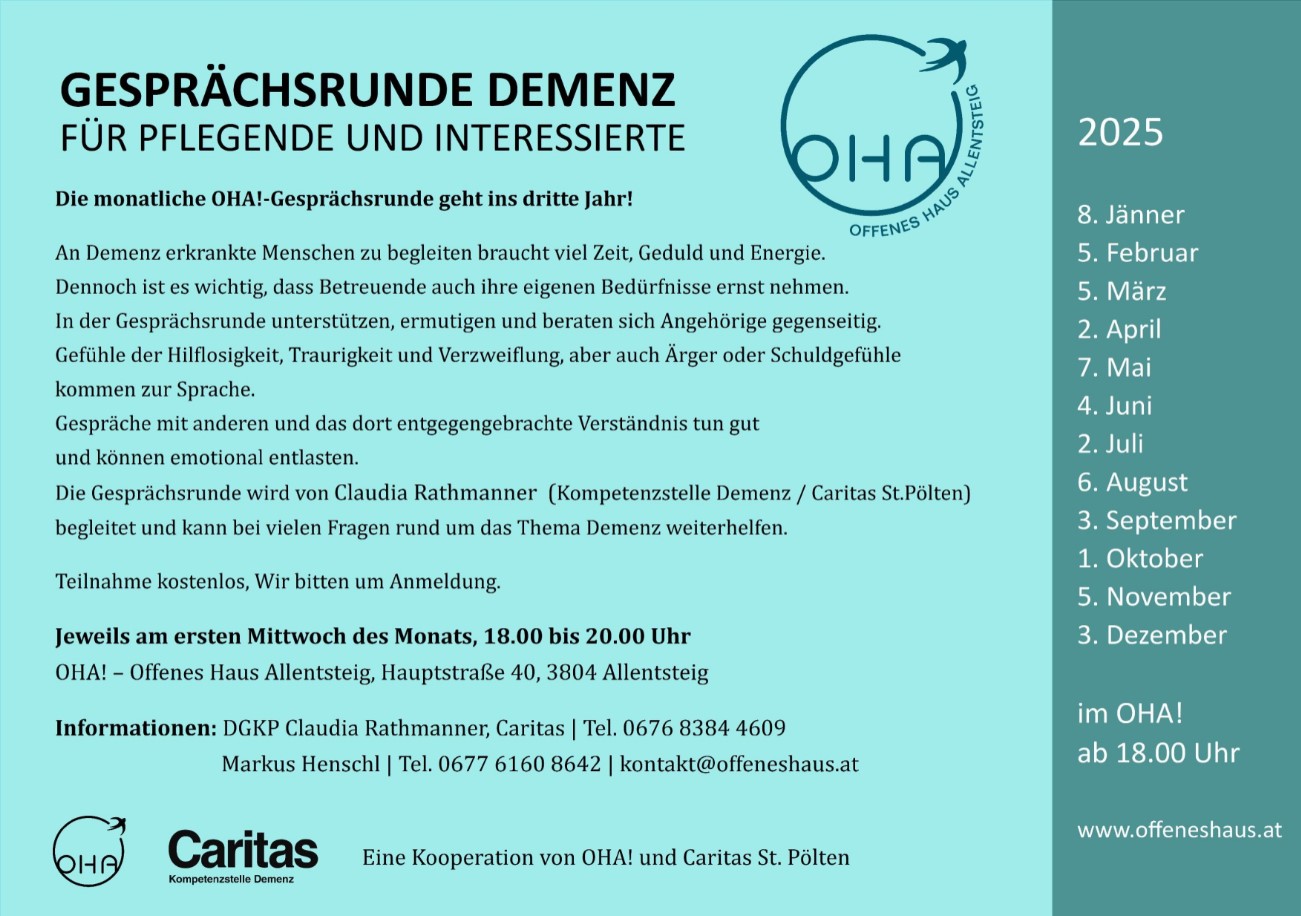 Die Gesprächsrunde Demenz wird von Claudia Rathmanner (Kompetenzstelle Demenz/Caritas St. Pölten) begleitet und kann bei vielen Fragen rund um das Thema Demenz weiterhelfen. Teilnahme kostenlos, wir bitten um Anmeldung.