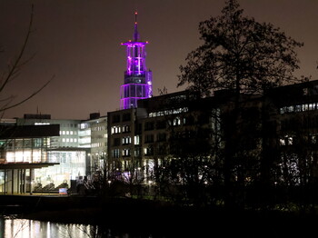 Auf Initiative von Caritas und Land NÖ leuchtet der Klangturm in St. Pölten lila.